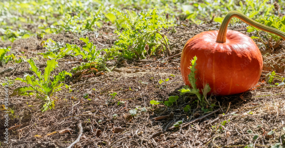 Tiny and fresh Halloween pumpkin on grassy field. Freshness and Halloween concepts. Large copyspace.
