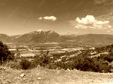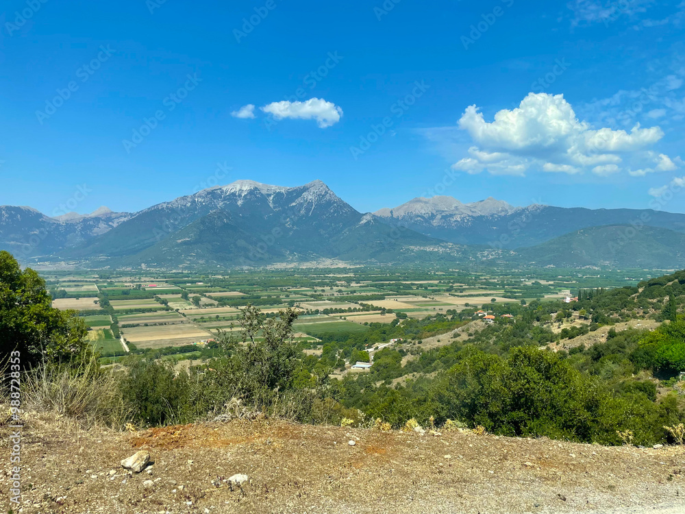 Green slopes and distant mountains with trees, lush olive groves and fieldsunder a bright blue sky. View from a remote mountain village. Greece.