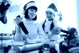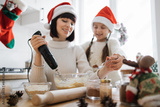Caucasian mother and daughter baking together in kitchen wearing Santa hats. Woman using hand mixer while young girl measures ingredients. Festive atmosphere with Christmas decor and family bonding.