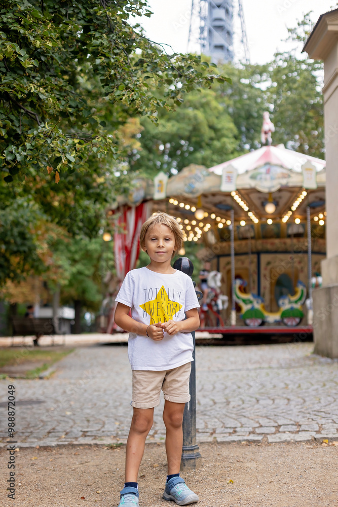 Child, going on Merry Go Round, kids play on carousel in the summer