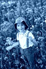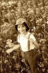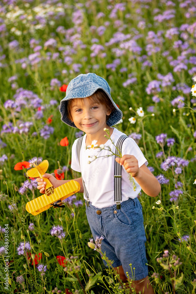 Beautiful school child in a flower field on sunset, playing with airplane and vintage suitcase