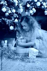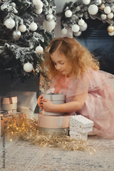 Curly girl opens gifts by Christmas tree.