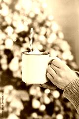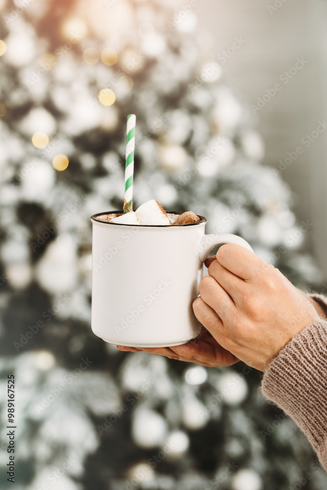 Woman in sweater holding cocoa with marshmallows in hands. Christmas eve with cup of tasty hot chocolate cozy holiday atmosphere at home. Cozy Christmas background, defocused tree, lights.