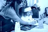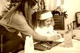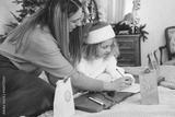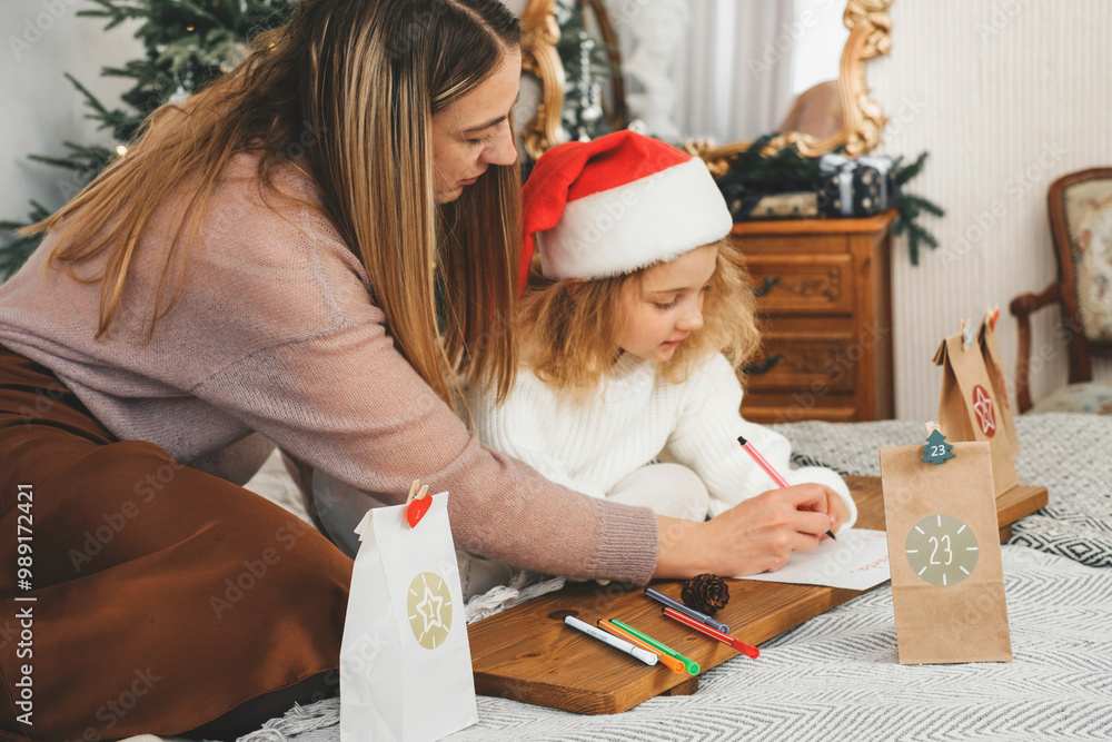 Mother with toddler girl writing Christmas letter and doing advent calendar tasks in bedroom. Festive activities for children at home. Happy dreaming girl creating craft