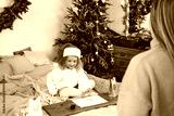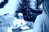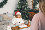 Family Christmas celebration, kid waiting for advent calendar present, writing letter Toddler girl excited about festive surprise in craft bag at home. Family celebration and preparation for New Year