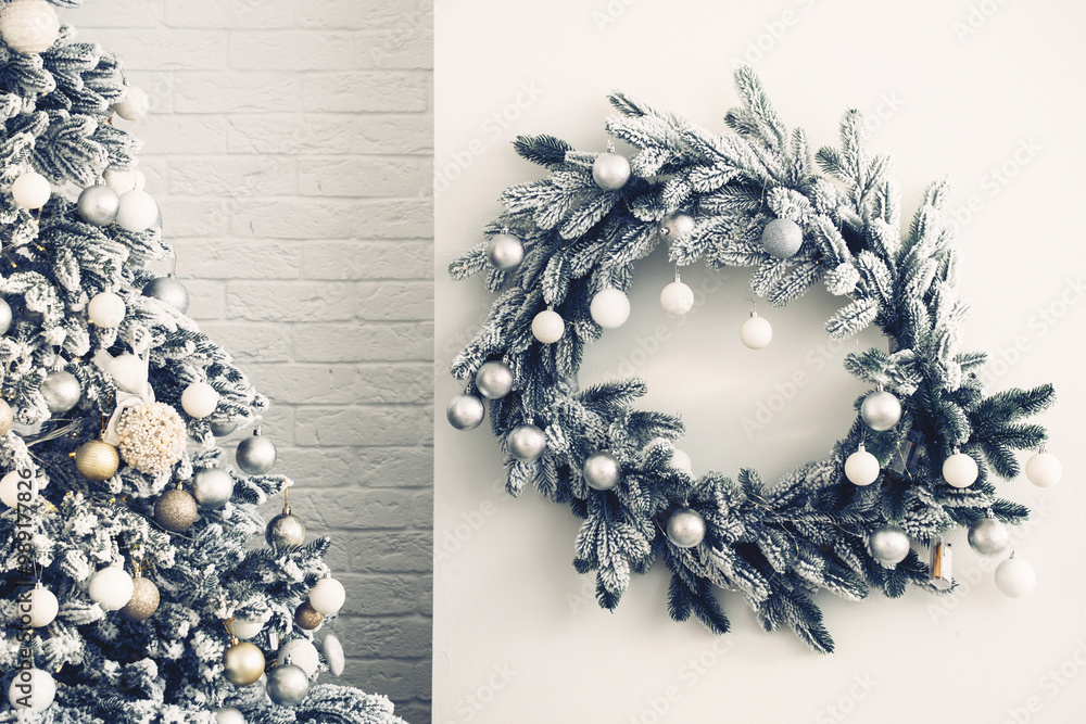 Banner White decorated Christmas tree , bokeh background, copy space. Closeup of New Year decor. Festive card with wreath