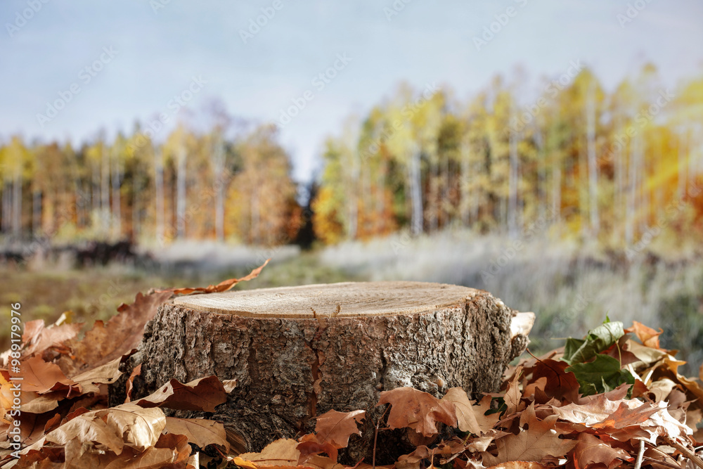 Wooden tree trunk with autumn leaves with autumn background. Copy space for products.