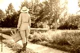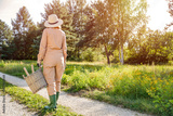 Woman gardener in garden suit in autumn time. Cleaning and working in a garden in autumn time.