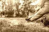 Woman gardener legs in brown garden suit in green rubber boots. Cleaning and working in a garden in autumn time.
