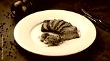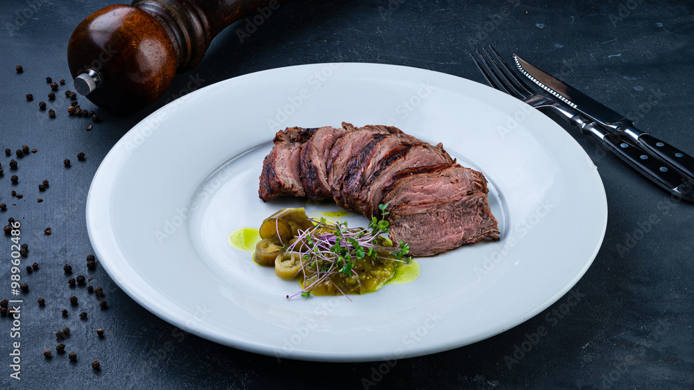 Fried cut beef fillet steak with salad of pickled cucumbers, jalapeno peppers and microgreens.