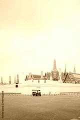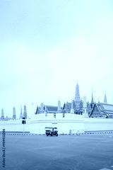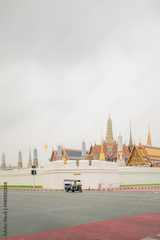 asia local travel in city activity with local taxi (tuk tuk) parking for wait tourism on street of bangkok Thailand with grand palace landmark background