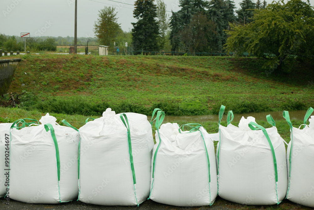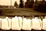 Barrier sandbag protection flood river water barrier flooded wall rain threat houses building villages Troubky cars infrastructure raining Europe