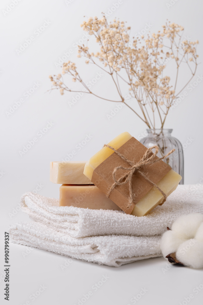 Natural, eco-friendly bath essentials featuring handmade soap bars and soft towels