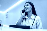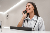 Young doctor woman talking to patient on mobile phone, smiling, using computer at workplace, telling healthcare checkup test results, bringing good news, using modern technology for communication