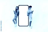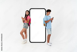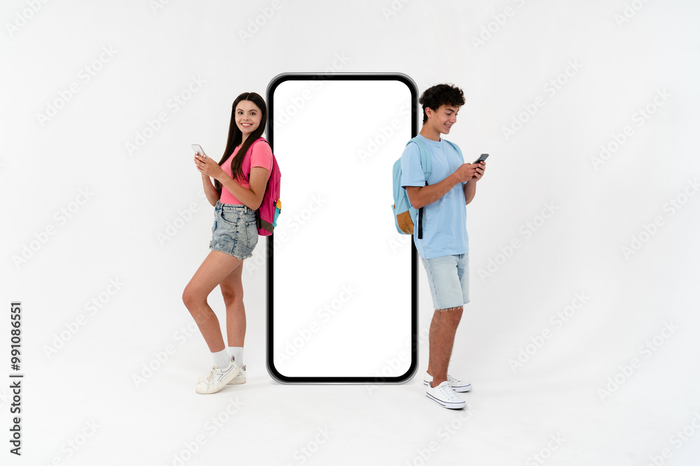 Full body high school pupils students teenagers boy girl in casual standing near big huge smart mobile cell phone with blank screen workspace area chatting isolated on white background.
