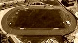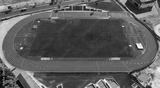 Aerial view of a sports facility with the running track. Empty athletics stadium with blue track.
