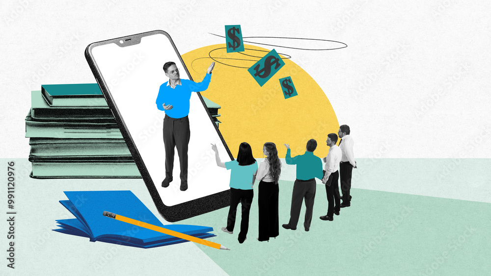 Group of people watching virtual teacher on smartphone who explains financial concepts. Remote education and digital presentations. Contemporary art collage. Concept of business and education, skills
