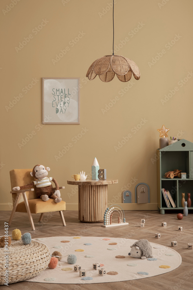 Minimalist composition of warm kid room interior with copy space, yellow wall, design furnitures , plush toys and personal accessories. Home decor. Template.
