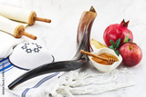 Rosh Hashanah. Jewish New Year composition with shofar, honey, apple, and pomegranate.