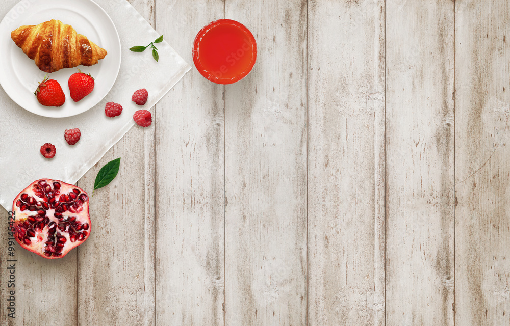 Fruit breakfast with free space on wooden table. Croissant, pomegranate, raspberries, juice, strawberries with top view.