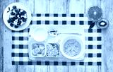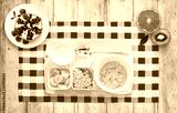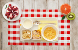 Healthy breakfast of fruit and cereal. Wooden table, top view.