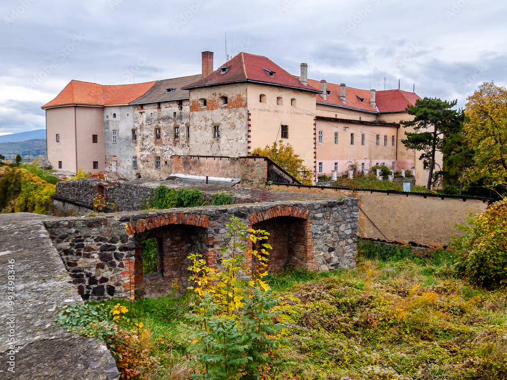 uzhhorod, ukraine - 20 oct 2007: castle on restoration. urban scenery on a cloudy day in autumn. popular travel destination