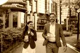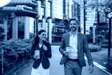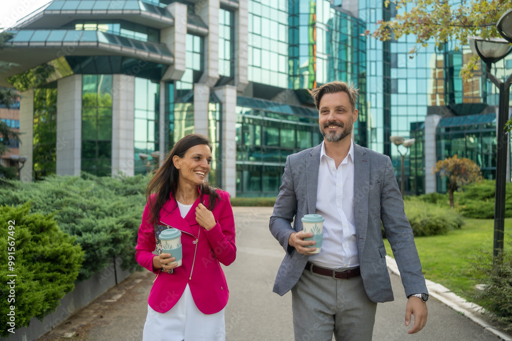 Confident business people in a discussion while walking with coffee. Mature professionals having a discussion at coffee break in front og glass building exterior.