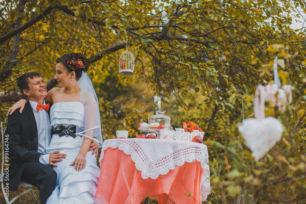 love, dating, people and holidays concept - wedding couple drinking champagne on picnic outdoors
