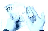 Isolated female hands holding euro banknotes and coins.