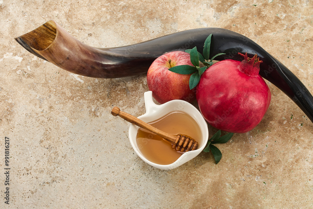 Rosh Hashanah. Jewish New Year composition with shofar, honey, apple, and pomegranate.