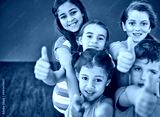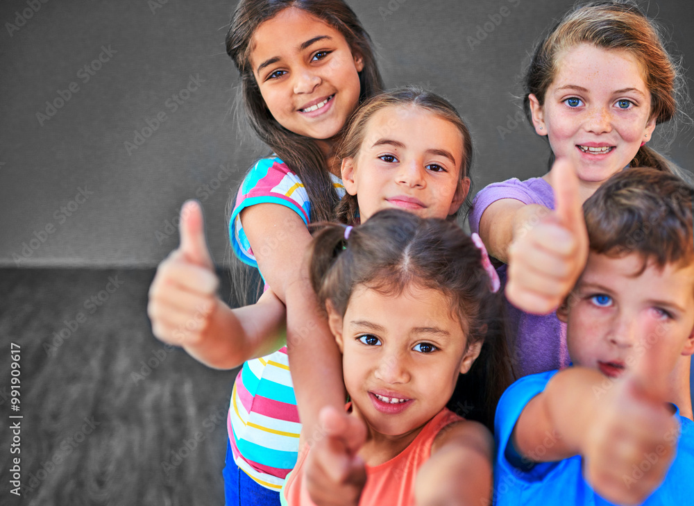 Children, group and thumbs up in portrait at school for learning success, education approval and yes to knowledge. Students, kids and diversity with hand gesture for thank you, agreement and happy