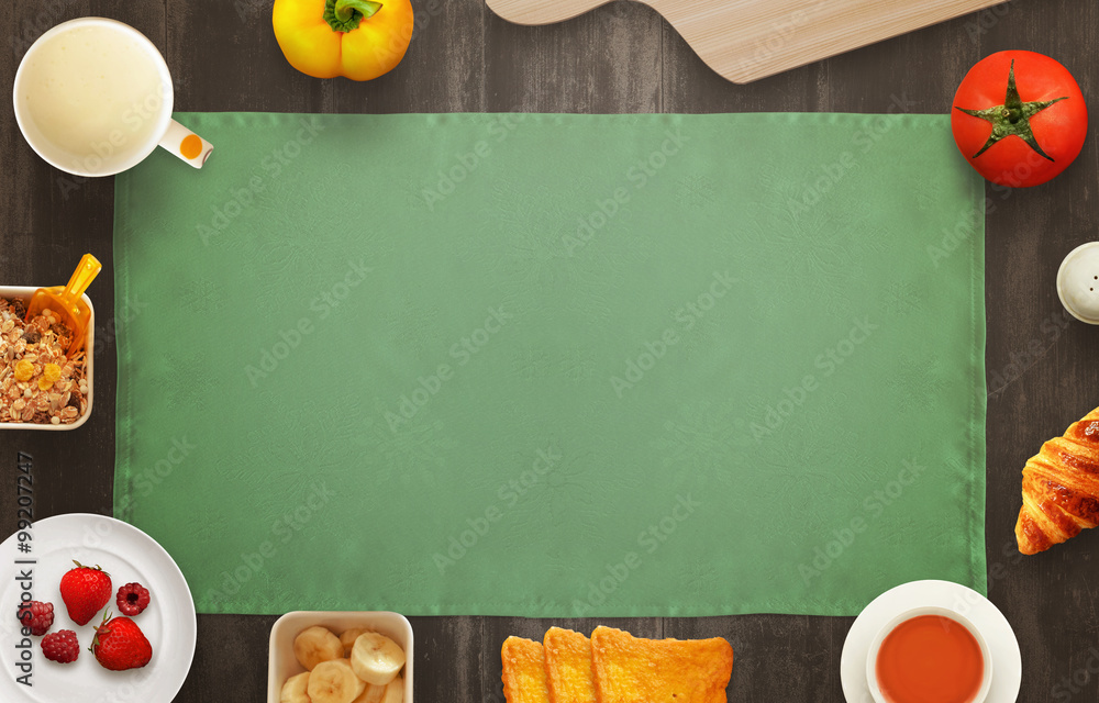 Breakfast scene with free space, fruits, toast, cutting board, tea on table.