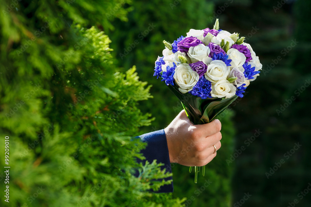 beautiful wedding bouquet in hands of men
