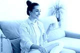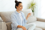 Beautiful young woman leads healthy life style concept. Happy arabian or indian brunette female is holding a glass cup of clean water in the morning, while sits on sofa in living room at home, smiles