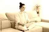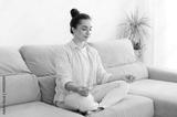 Relaxation in the morning. Calm pretty young arabian or indian woman in a cozy living room, sitting on sofa and meditating in a lotus position with eyes closed, doing yoga mindfulness training