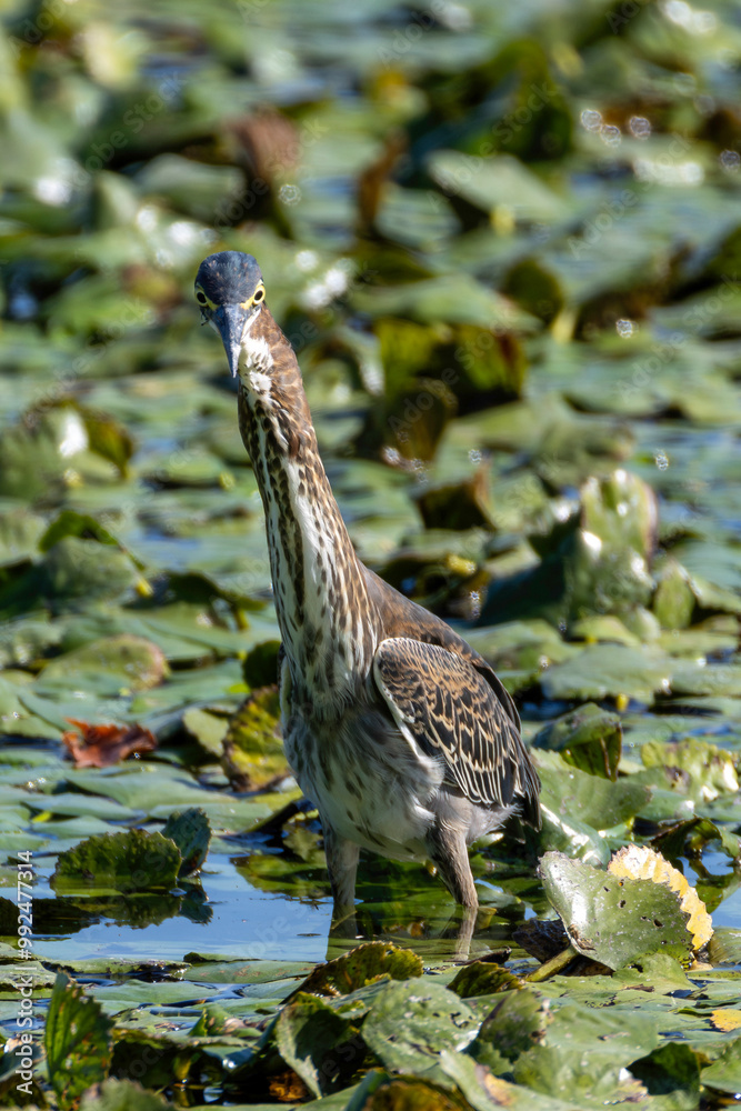 Green Heron walking and hunding on weed covered water