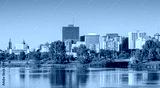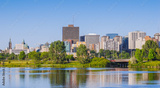 Ottawa River and capitol city skyline along the parkway - late springtime afternoon - early evening approaches. Tall buildings, apartments and condominiums comprise an Ottawa city skyline.
