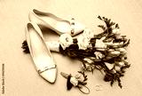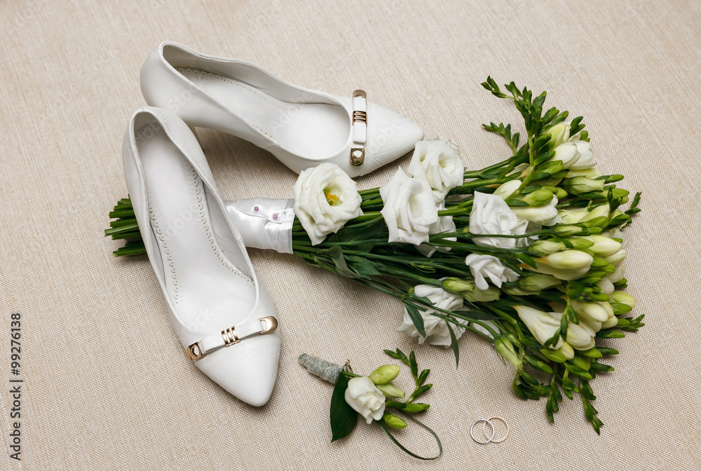 wedding bouquet and bridesmaid shoes, boutonniere, and ring.