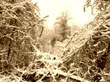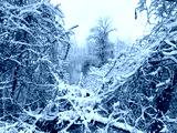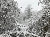 Deep in the forest on a snowy winter day. Trees covered in white snow.