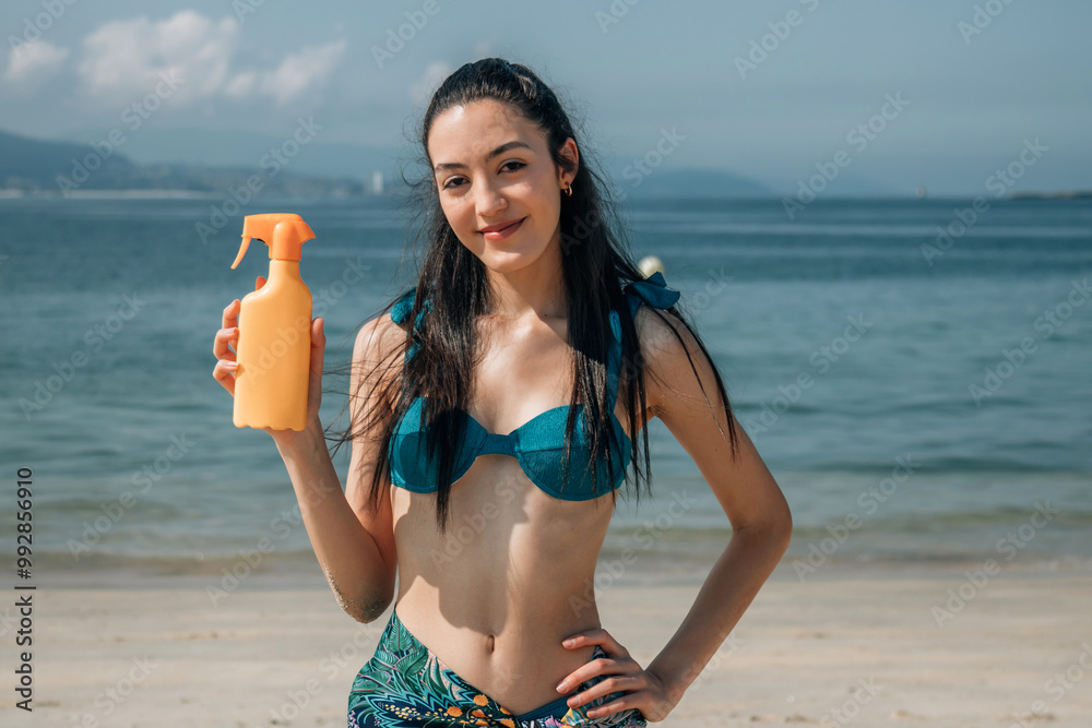 Suncream. Suntan Lotion Beautiful Woman Applying on beautiful on Shoulder. Sunscreen Solar Cream. Skin care. Sun protection.