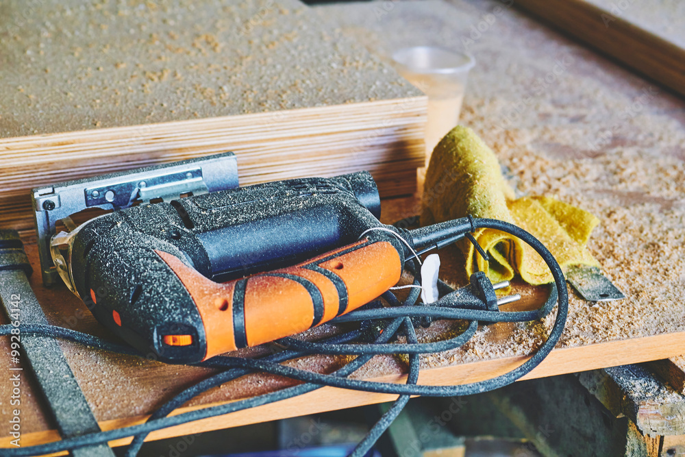 Heating industrial dryer gun tool, wood plywood sheets and sawdust