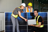 workers or technicians working on laptop computer and holding solar panel in the factory