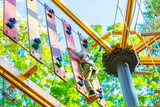 brave little boy in helmet climbing at adventure park in autumn season. Work out concept