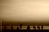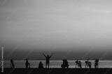 silhouettes of bicycles and Asian people relaxing on the beach by the sea in the morning at sunrise in summer in Asia