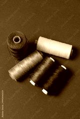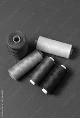 Top view of grey and black thread spools on dark background