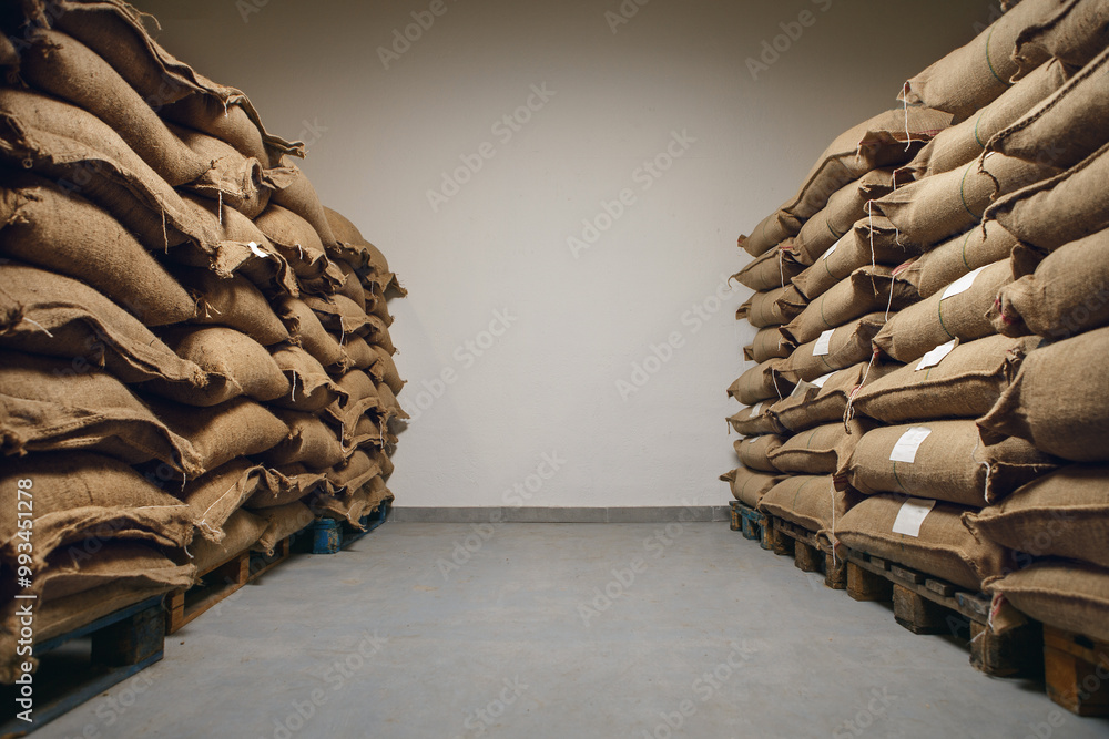 Jute Coffee Bags Stacked Neatly in Warehouse Showcasing an Organized Storage Area for Coffee Beans Also Having Free Copy Space