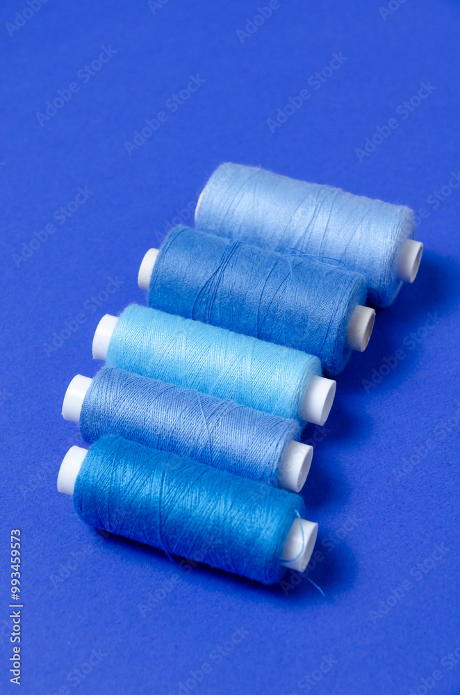 Top view of thread spools on blue background