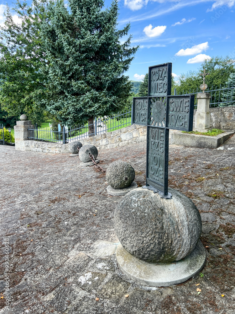 A rosary of "Polish saints" made of stones, placed around the Sanctuary of St. Swierad and Benedict in Tropie, Poland