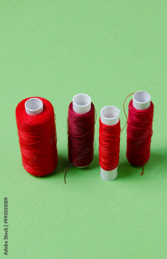Top view of red thread spools on green background