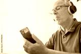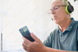 Senior man with glasses uses headphones to listen to music from his playlist on the phone. Elderly person using modern technology devices.